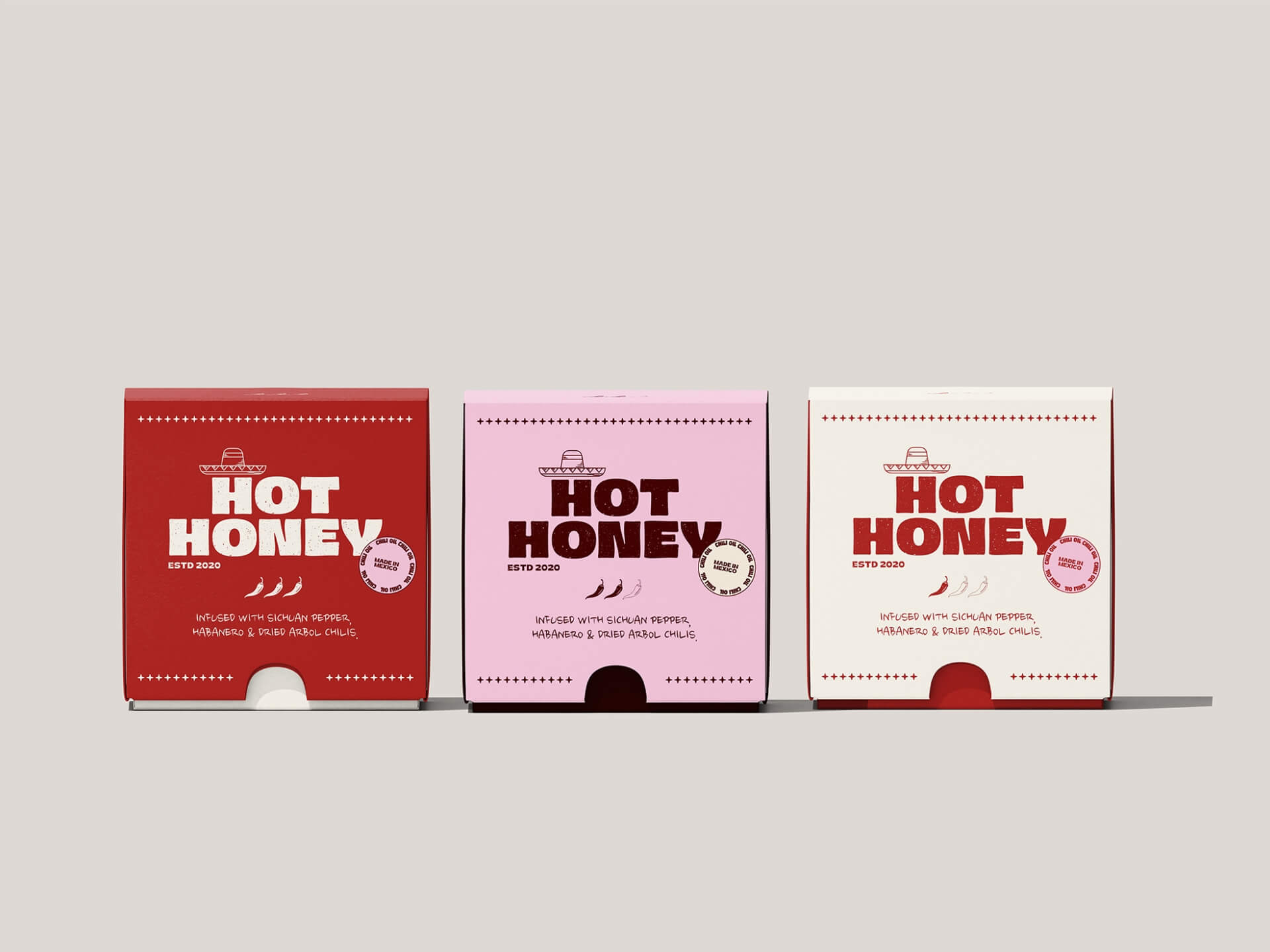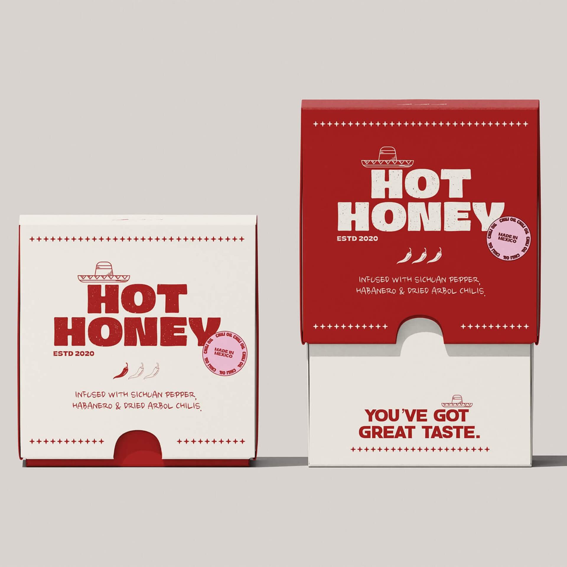 Die Idee war, Geschmack sichtbar zu machen. HOT HONEY übersetzt Wärme und Schärfe in eine klare visuelle Sprache. Markante Typografie, kräftige Farben und abstrahierte Street-Food-Referenzen formen ein reduziertes Packaging-System mit direkter Wirkung. Alltagstauglich, charakterstark und visuell konsistent – vertraut im Gefühl, klar in der Haltung.
