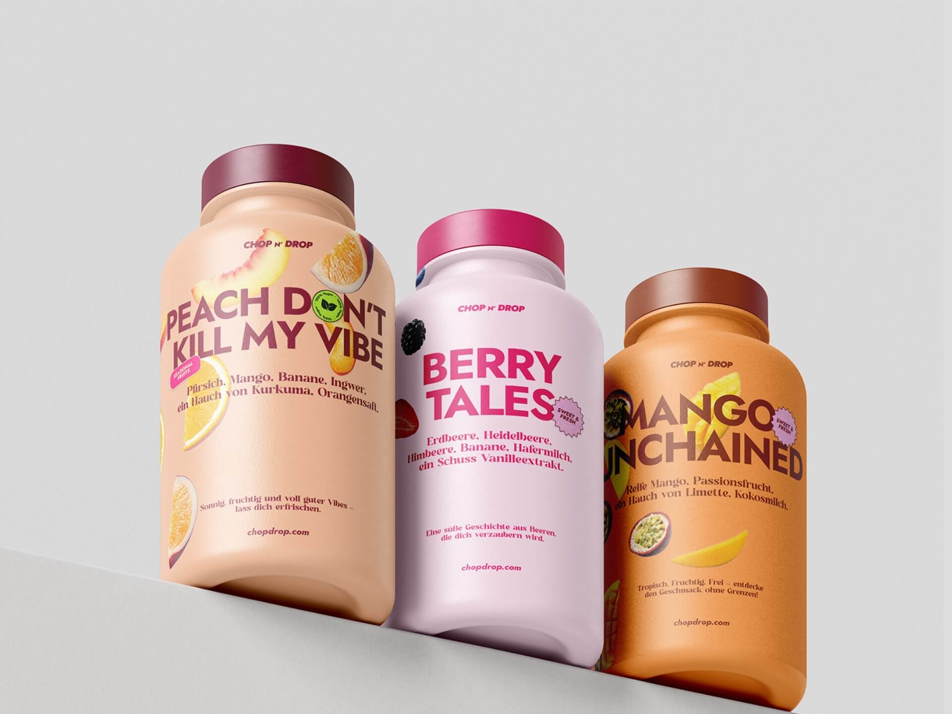 Chop N’ Drop denkt Food über Sprache. Wortspiele und Popkultur-Referenzen bestimmen Ton und Haltung der Marke. Ein copy-first Ansatz, der sich in plakative Typografie, klare Farben und ein auffälliges Branding übersetzt – durchgängig über Packaging, App und Kampagne.