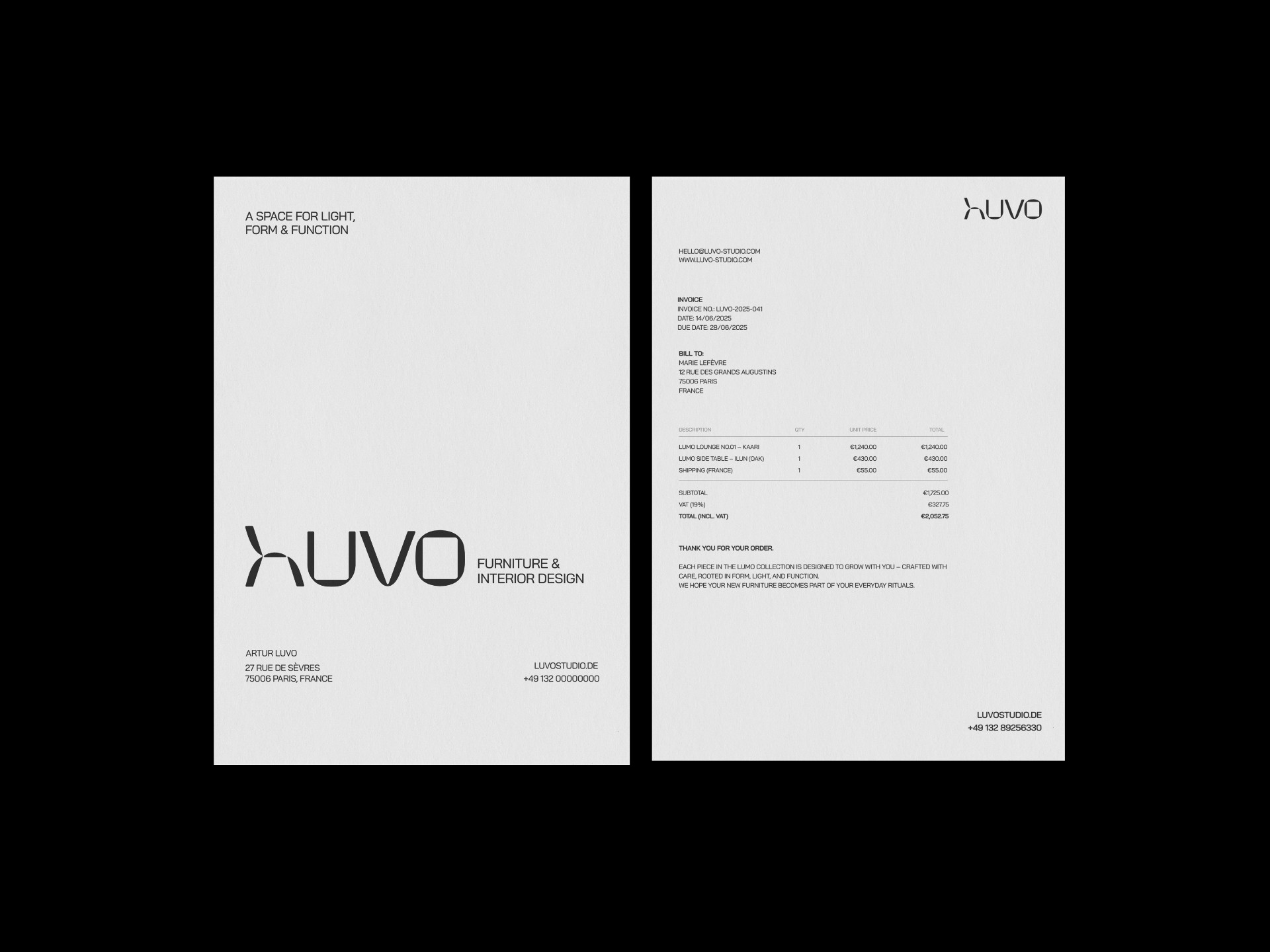 Luvo Studio setzt im Branding bewusst auf Zurückhaltung, um den Möbeln Raum zu geben. Eine reduzierte Formensprache, ruhige Typografie und klare Strukturen schaffen einen visuellen Rahmen, der Materialität und handwerkliche Qualität in den Fokus rückt. Das Design ordnet und hält sich zurück – präzise, zeitlos und langlebig.